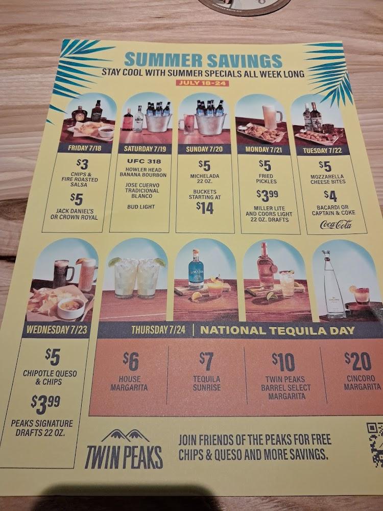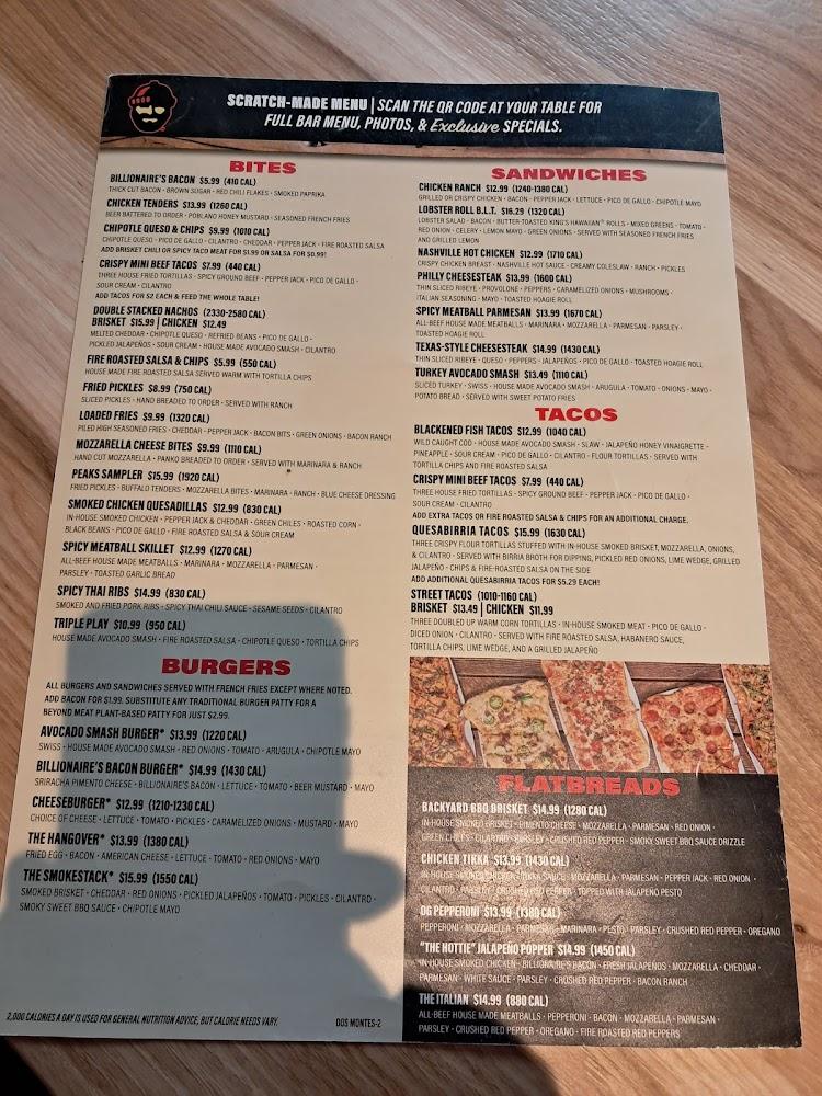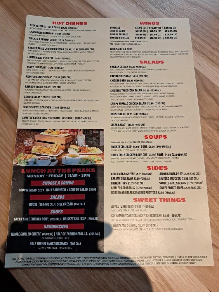 Twin Peaks has an extensive menu filled with American comfort classics. The offerings include burgers, wings, sandwiches, and salads. Signature dishes like the Billionaire's Bacon Burger and Spicy Thai Ribs keep diners coming back. Each dish highlights rich flavors and generous portions. The average price is around $14.85, ensuring a hearty meal without breaking the bank. Small bites like crispy mini beef tacos and loaded fries make ideal shares for groups. Lighter options are also available for those looking for heartier fare. Brunch, lunch, and dinner specials cover a wide range of tastes. Seasonal variations and local selections add an exciting twist to the food experience. Choices cater to everyone, including kids, with a dedicated menu for younger diners. No matter the occasion, diners will find something delectable to savor at Twin Peaks.